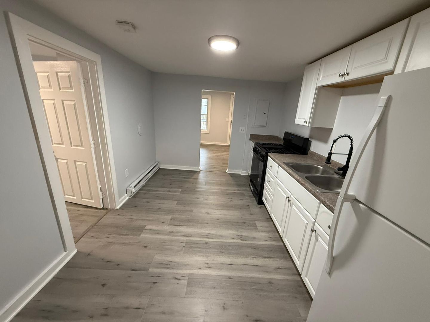 Kitchen equipped with fridge, stove, and oven